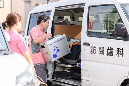診療所と同じ治療ができるように、多くの機材を持ち運び、治療・口腔ケア等を行っています。